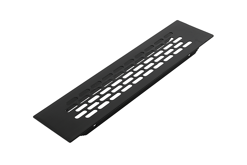 Алуминиева вентилационна решетка в цвят черен. Вентилационната решетка работи добре при вграждане на уреди за вграждане в кухнята и банята м. вградена фурна, хладилник. Вентилационната решетка осигурява правилна циркулация на въздуха, предотвратява прегряване на мебелите и отлагане на влага в структурата им. Вентилационната решетка е подходяща за монтаж в мебели, но не може да се използва в стени и вентилационни канали.