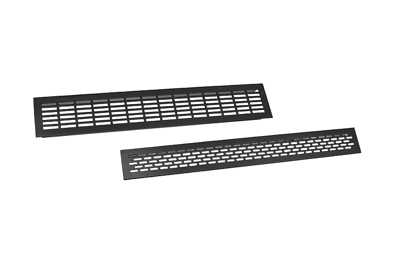 Алуминиева вентилационна решетка в цвят черен. Вентилационната решетка работи добре при вграждане на уреди за вграждане в кухнята и банята м. вградена фурна, хладилник. Вентилационната решетка осигурява правилна циркулация на въздуха, предотвратява прегряване на мебелите и отлагане на влага в структурата им. Вентилационната решетка е подходяща за монтаж в мебели, но не може да се използва в стени и вентилационни канали.