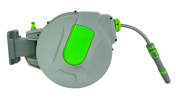 Автоматична макара за маркуч, в комплект с 15 метра маркуч, струйник и бърза връзка. С опция за монтаж на стена.