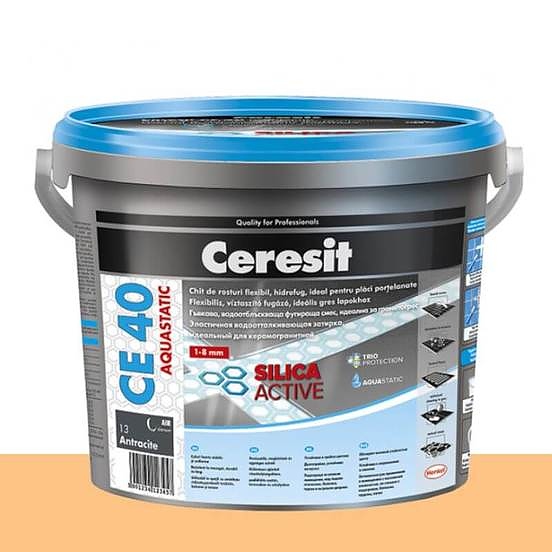 CERESIT CE 40 е гъвкава, водонепропусклива, аквастатична фугираща смес за фуги с широчина до 8мм. Фугиращата смес е разработена по телхнологията Silica Active и е подходяща за фугиране на фаянс и други видове керамика, стъкло, мозайки, естествен камък, гранитогрес и мрамор (нечувствителен към обезцветяване). Подходяща също за употреба върху деформиращи/чувствителни основи. Може да се използва на открито и закрито, както и върху подове с подово отопление.