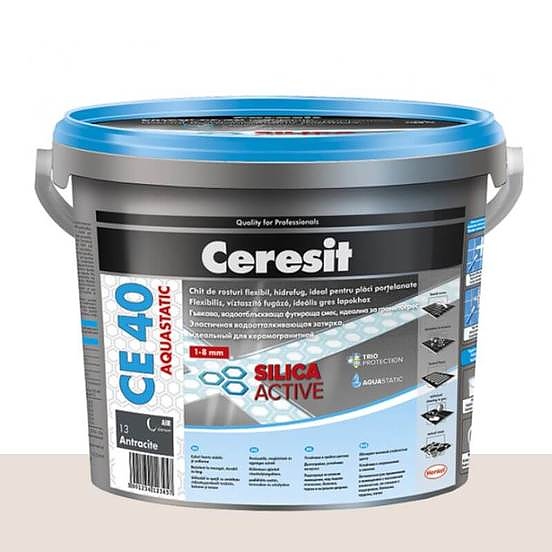 CERESIT CE 40 е гъвкава, водонепропусклива, аквастатична фугираща смес за фуги с широчина до 8мм. Фугиращата смес е разработена по телхнологията Silica Active и е подходяща за фугиране на фаянс и други видове керамика, стъкло, мозайки, естествен камък, гранитогрес и мрамор (нечувствителен към обезцветяване). Подходяща също за употреба върху деформиращи/чувствителни основи. Може да се използва на открито и закрито, както и върху подове с подово отопление.