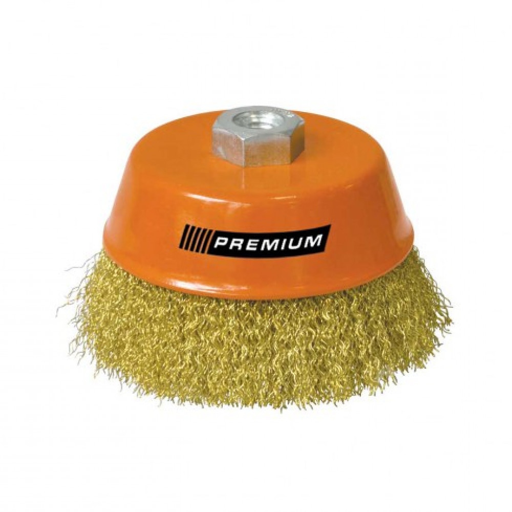 Телена четка за флекс камбана PREMIUMTOOLS изработена от месинг. Подходяща за заглаждане или отстраняване на грапавини, почистване на заваръчни шевове, отстраняване на боя или засъхнало лепило и други. Чашковидна телена четка за бормашина и мултишлайф, направени от вълнообразна стоманена тел със заострени краища.