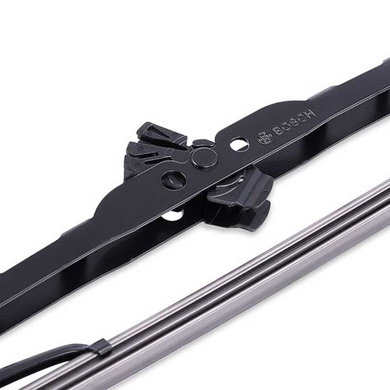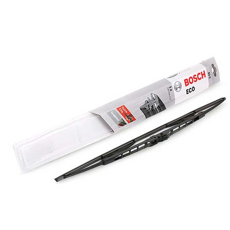 Стандартни чистачки за автомобили с рамо тип кука Bosch ECO. Ефективно почистване с перото от натурална гума с графитно покритие. Дълъг срок на експлоатация благодарение на солидната метална шарнирна система. Бърз монтаж с преасемблирания адаптор Quick-Clip. Чистачките са произведени от висококачествен естествен каучук с графитено покритие за по-голяма издръжливост. ECO серията осигурява по-висока безопасност и по-добро решение от заменимите модели в този клас чистачки.