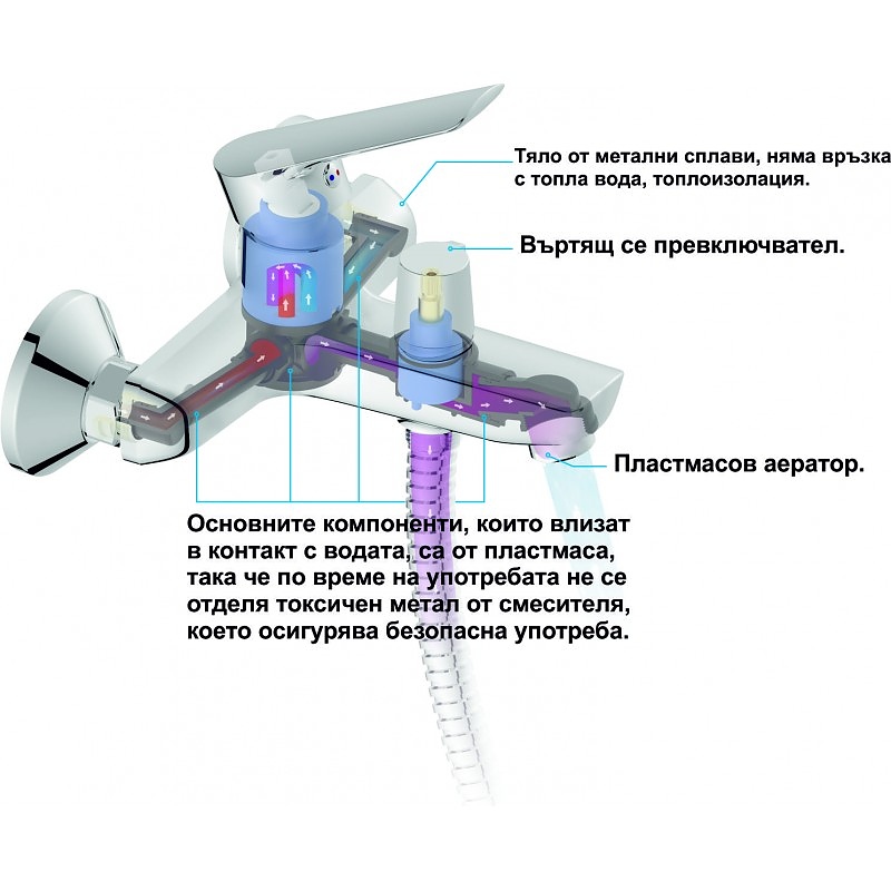 Смесител за вана и душ Даниста 6280198 е универсален модел, който е съвместим с всяко тръбно окачване или подвижен душ, който се свързва посредством мека връзка.Тялото на батерията е изработено от метални сплави и е проектиран с топлоизолация. Така не се осъществява връзка с топлата вода. Основните компоненти, които влизат в контакт с нея са от пластмаса. Това гарантира безопасна употреба, защото не се отделя токсичен метал от смесителя. Смесителя е с въртящ се превключвател и пластмасов аератор.