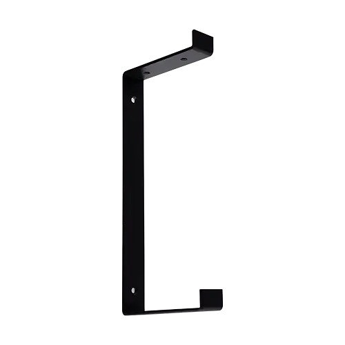 Минималистична скоба, която ви позволява да инсталирате два рафта. Изработена от плоска лента, огъната под прав ъгъл, завършена с чупки, покриващи рафтовете.