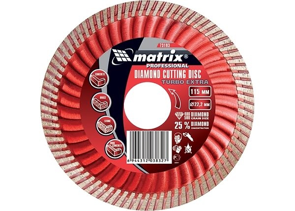 Диамантен диск за сухо рязане MTX PROFESSIONAL Turbo Extra е с размери 150 х 22,2 мм. Разполага с по-често турбиране, осигуряващо по-добро отстраняване на отработения материал и охлаждане на режещия слой. Дисковете Turbo Extra се характеризират с увеличена концентрация на диаманти, по-добро качество на диамантените зърна и оптимално подобрена метална свръзка. Тези предимства осигуряват висока производителност и продължителен срок на експлоатация.