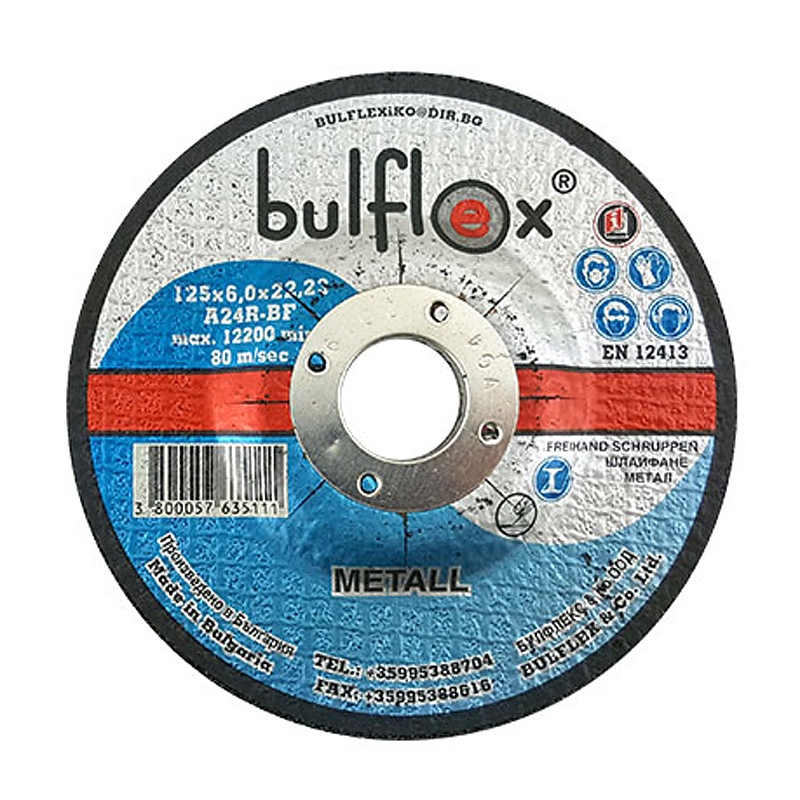 Диск за шлайфане на метал, произведен от фирмата BULFLEX. Аксесоарът за шлайфане притежава достатъчно добри характеристики, превръщащи го подходящ избор за професионалистите. Дискът е изработен от карбофлекс. Аксесоарът за шлайфане е предназначен за пневматични и електрически ъглошлайфи. Външният диаметър на диска е 125 мм., докато вътрешният диаметър е определен на 22 мм. Дебелината на шлайфащия аксесоар е 6 мм. Работните обороти, които може да достигне дискът за шлайфане, са 12200 об./мин.