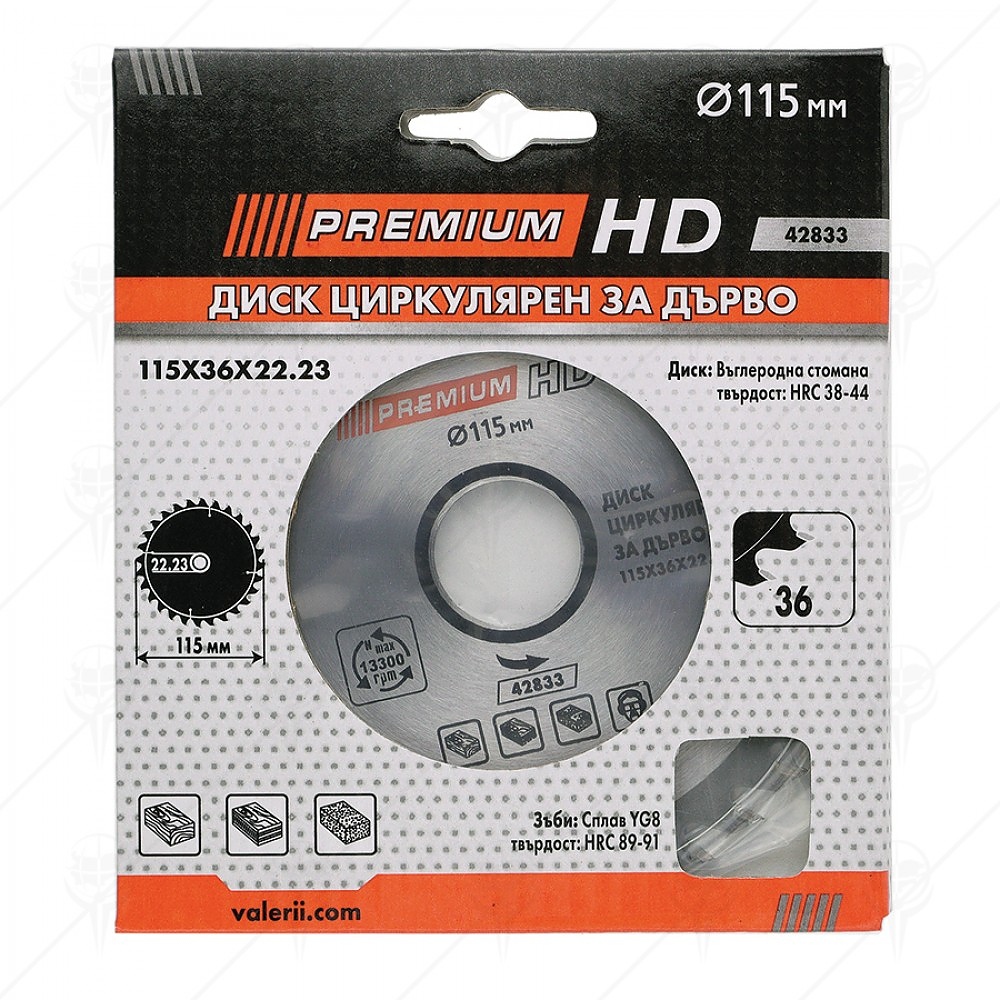 Дискът е изработен от въглеродна стомана с твърдост HRC38-44. Външният диаметър на диска е 115мм, а вътрешния 22.23мм. Дискът притежава 36 броя зъби, изработени от сплав YG8.