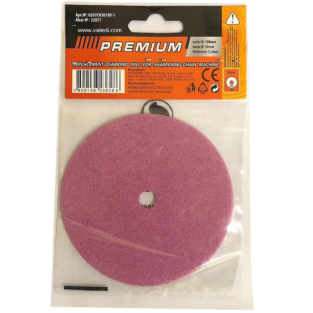 Дискът е вътрешен диаметър 10мм, външен диаметър 100мм и дебелина 3.2мм. Отличава се с високо качество на абразива. Съвместим с машина за заточване на вериги PREMIUM