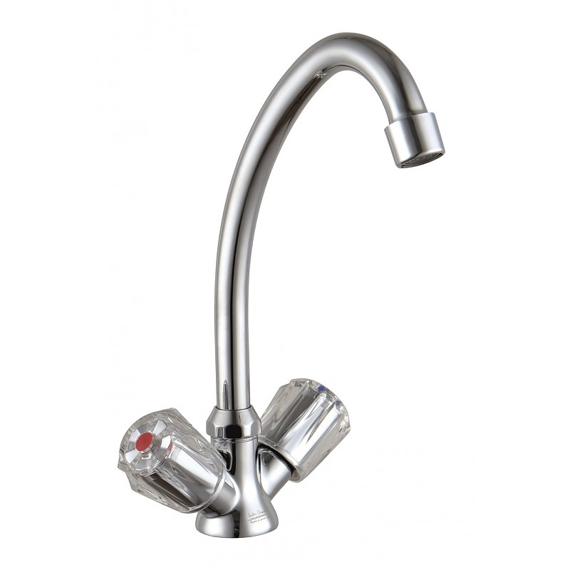 Двуръкохватков месингов смесител за кухненска мивка.Дълготраен блясък, благодарение на качественото хромово покритие.Затварящият каучуков механизъм осигурява идеално смесване на водата.Предвиден е за стоящ монтаж.