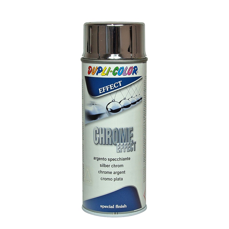 Спрей с хромиран ефект DUPLI COLOR с висок блясък, който придава дългосрочен вид, наподобяващ хром. Подходящ за всички гладки повърхности като метал, дърво, стъкло, пластмаса и др. Серията Chrome се характеризира с висококачествен акрилeн ефект. Спреят е устойчив на вода и почистващи препарати. Не е подходящ за използване върху предмети за ежедневна употреба. Отличава се с отлична адхезия, висок гланцов ефект и много добро покритие.