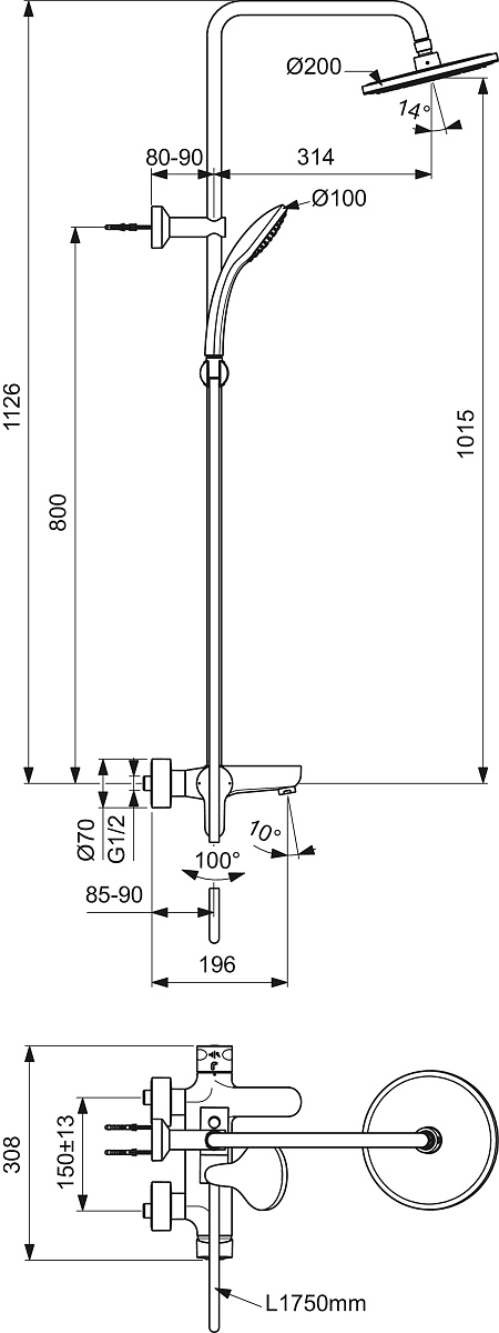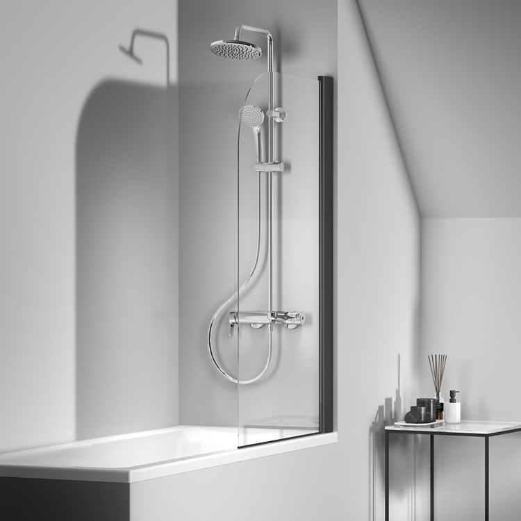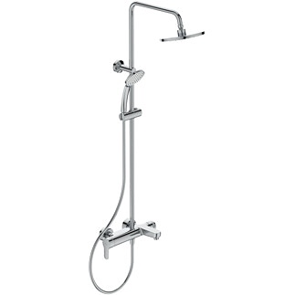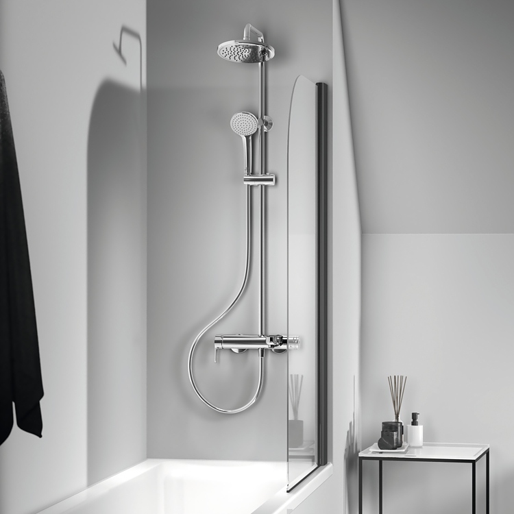 Cerafine O душ система с едноръкохватков смесител за вана/душ, масивно месингово лято тяло, 38 mm керамичен затварящ механизъм FirmaFlow® с ограничител на топла вода, скрито присъединяване - без видими холендрови гайки, метална ръкохватка с индикатор за топла и студена вода, трипътен керамичен ръчен разпределител, интегриран в тялото, душ глава Ø200 mm, ограничител на дебит 9,6 l/min, ръчен душ Ø100 mm, 1-функционален, ограничител на дебит.