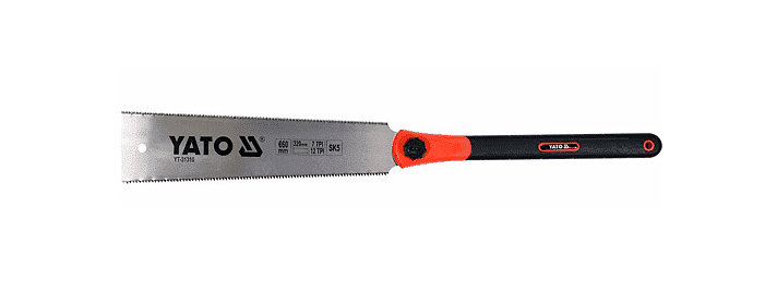Двустранен японски ръчен трион (тип Ryoba). Острието е прикрепено с винт към дългата дръжка, която изработена от ABS пластмаса с неприплъзващи се TPR вложки за по-голяма сигурност и в зависимост от нуждите може да се задава под различни ъгли. Специфична особеност на този тип трион е уникалната гъвкавост на острието, изработено от стомана SK5 и възможността за рязане в посока „към себе си“. Това позволява ефективно рязане по протежение на или върху напречните влакна. Има закалени зъби, разположени от двете страни на острието.