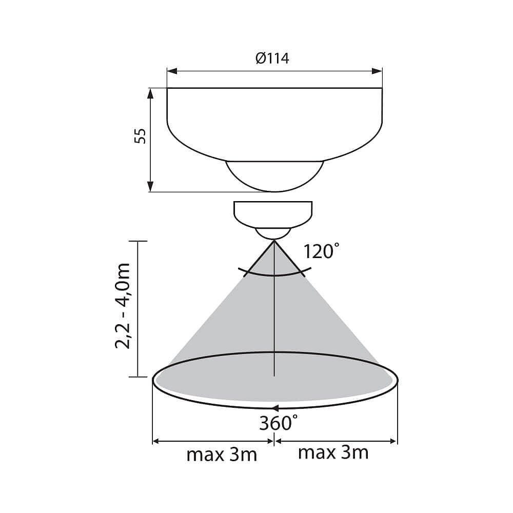 Стационарен сензор за монтаж на таван (за външен монтаж), бял. Обхват - 360 градуса. Максимално разстояние на действие до 3 m. Степен на прахо- и влагозащита - IP20.
