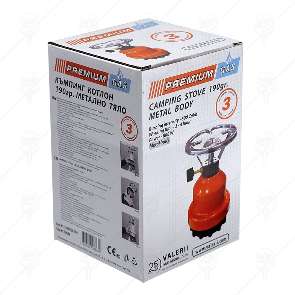 Къмпинг котлон за патрон 190гр. с метално тяло. (Газовият патрон не е включен в комплекта) Мощност: 800W Интензивност на горене: 690 Cal/h Продължителност на горене: 3-4 часа Максимална консумация: 62 gr/h