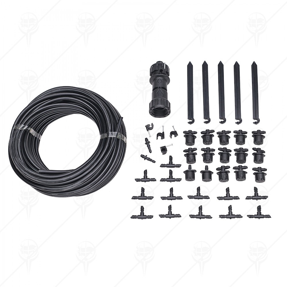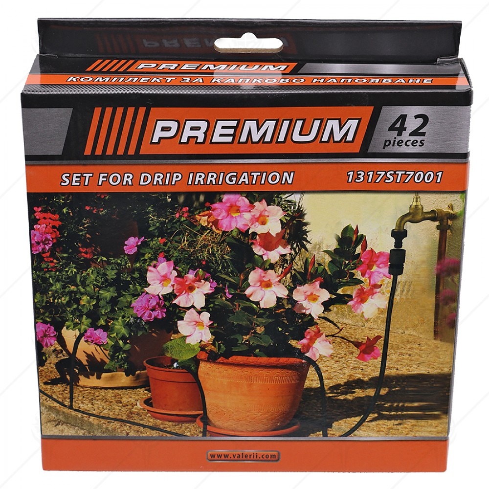 Комплект за капково напояване комплект PREMIUMGARDEN е достатъчен за напояване на 15 бр. малки саксии/ 15 бр. средно големи саксии/ 7 до 10 бр. големи саксии/ 7,5м. жив плет/ 6 кв.м. площ. Свързва се директно към водоподаването / към чешма/. Диаметър на маркуча ф7мм(външен)и ф5мм(вътрешен). Комплектът съдържа конектор за чешма (с вътрешна резба): 1бр, маркуч 15м: 1бр, междинни капкообразуватели: 13бр, крайни капкообразуватели: 2 бр, скоби: 5 бр и повдигащи скоби: 5 бр.