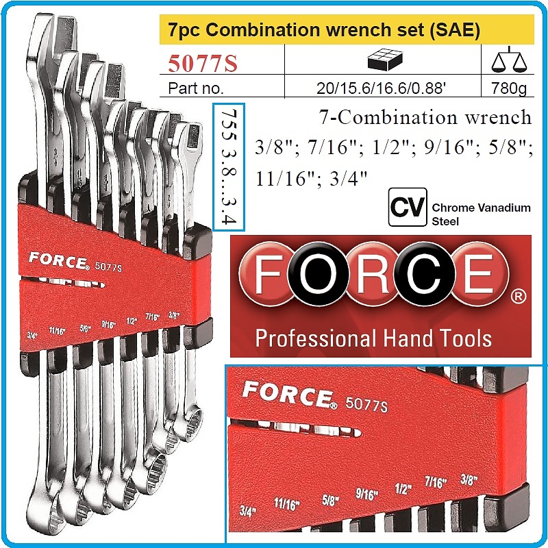 Комбинирани звездогаечни ключове, с наклон 15°, к-т 7 броя, 3/8"-3/4"AF, Force, 5077S
