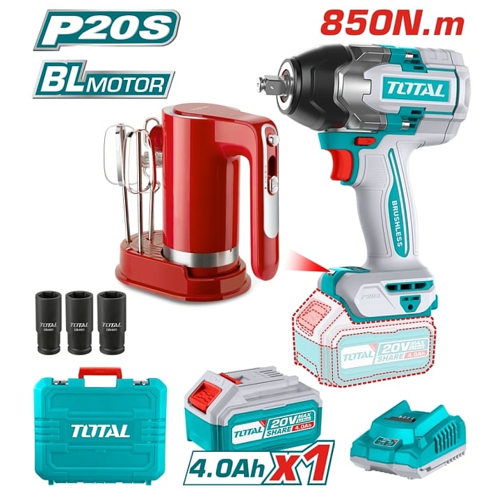 Комплект акумулаторен безчетков ударен гайковерт с батерия и зарядно TOTAL + акумулаторен миксер.