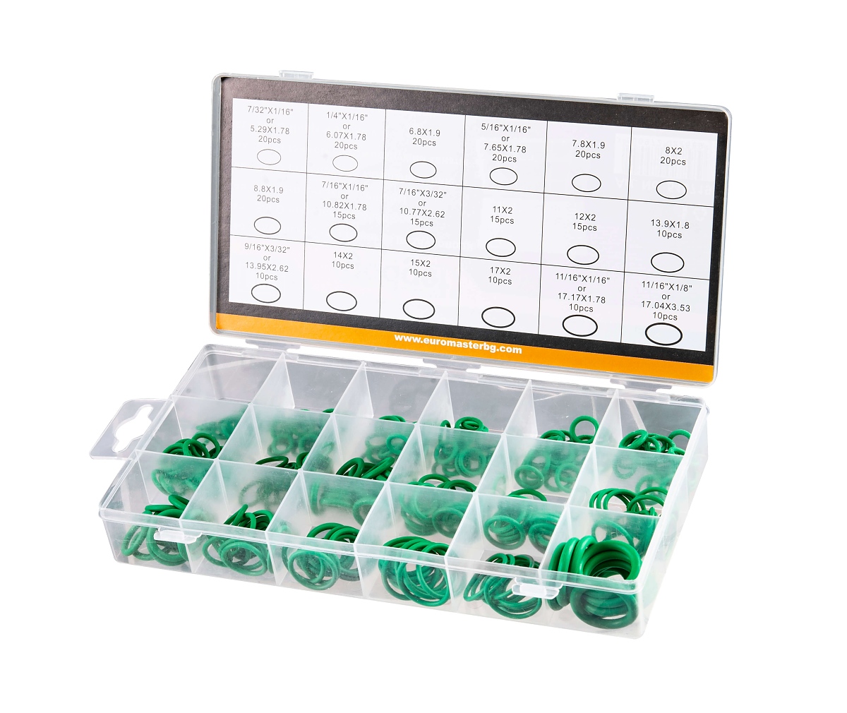 Практична кутия за съхранение с 18 отделения, в която са ясно обозначени и групирани различните по размер О-пръстени