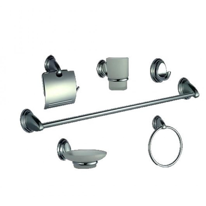 Комплект аксесоари за баня, включващ: Чашка за поставяне на четки за зъби. Ринг за поставяне на хавлиена кърпа; Чинийка за сапун; Закачалка; Пешкирник ; Поставка за тоалетна хартия с капак