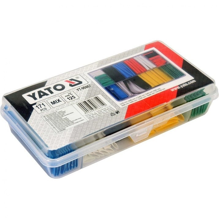 Комплект от 171 броя термосвиваеми шлаухи с различни диаметри, дължини и цветове. Всички са поставени в практична кутия, сортирани по размер.