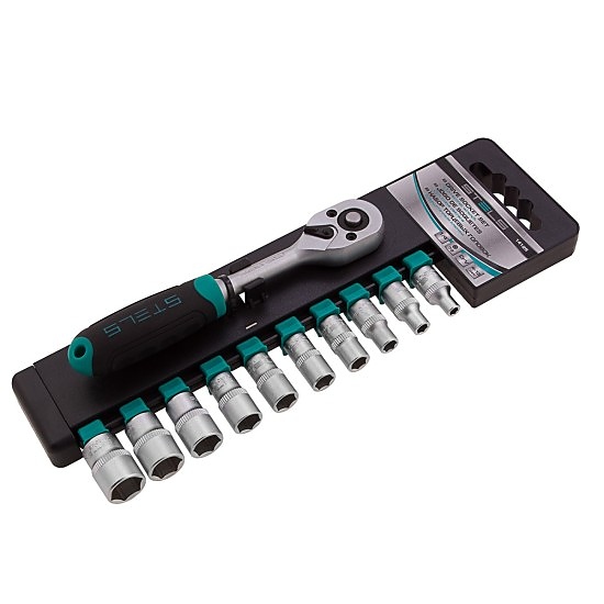 Комплект вложки, 1/4", 4 - 13mm, с тресчотка, 11ч. Продуктие на марка STELS се отличават със своята здравина и функционалност. Нови идеи при полу-професионалните ръчни и механизирани инструменти. Продуктите са подходящи за редица приложения. Те съчетават добър дизайн и качествена изработка с изключително съотношение цена-качество. В продуктите се влагат качествени материали, представляващи новите тенденции в техническия прогрес. Може да закупите произволен брой от тях с пълна увереност, че ще издържат. STELS произвежда богата гама от инструменти, които могат да се използват в домашни условия или професионално. Тези добри инструменти ще ви помогнат да направите проектите си много по-интересни и по-ефективни, а вашето хоби ще бъде истинско удоволствие.