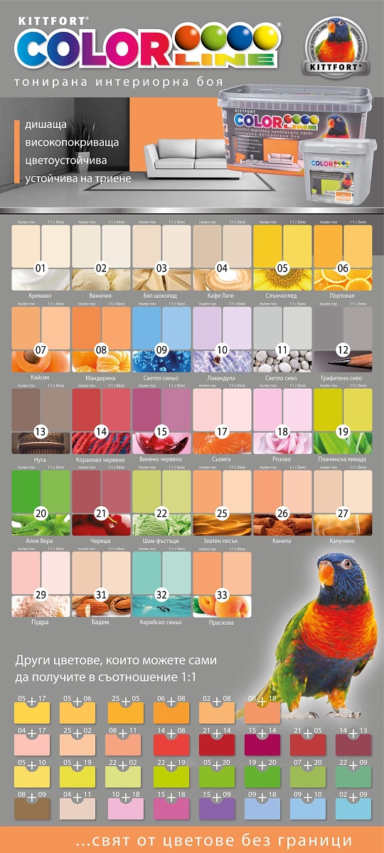 Kittfort Colorline® е тонирана интериорна боя за стени и тавани в най – желаните и модерни цветове. С нейна помощ ще постигнете смайваща промяна на заобикалящата Ви среда. Мислейки и за децата, в гамата са включени и най-актуалните цветове за детски стаи. Голямото цветно разнообразие от готови цветове и лесното нанасяне на боята ще Ви помогнат да превърнете средата около Вас в мечтания свят!