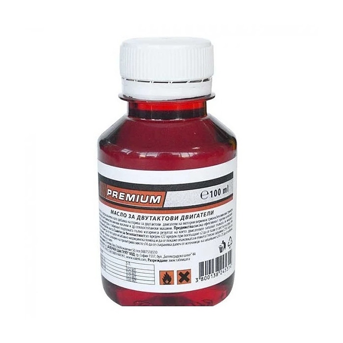 Масло за двутактови двигатели PREMIUM, разфасовка 0.100мл. Маслото е предназначено като добавка на горива за двутактови двигатели на моторни верижни триони, бензинови тримери, мотопеди, снегорини, бензинови косачки и други селскостопански машини. Маслото притежава висока ефективност против износване. Висока температурна стабилност. Подпомага пълното изгаряне, в резултат на което двигателите запазват пълната си мощност.