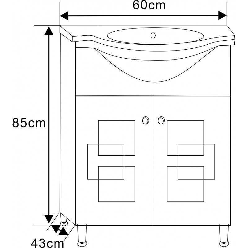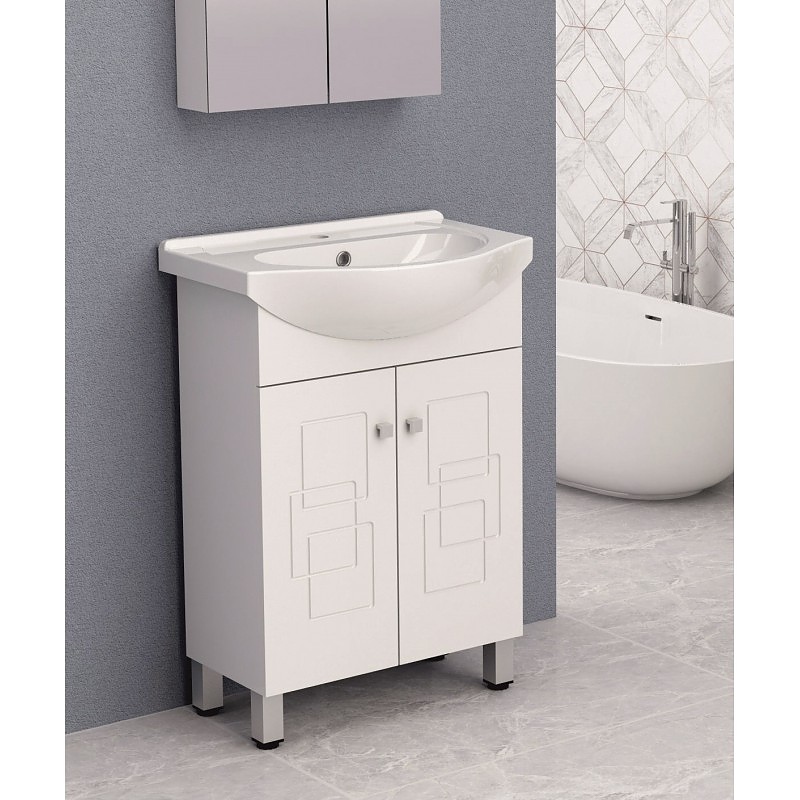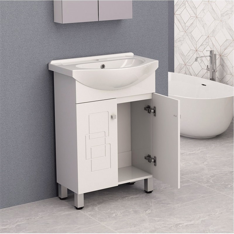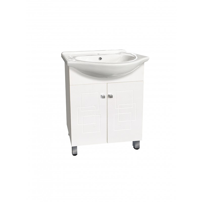 Комплект PVC шкаф за баня . Водо и влагоустойчив с нивелиращи се крачета и панти със „soft close“ механизъм. Бял порцеланов умивалник.