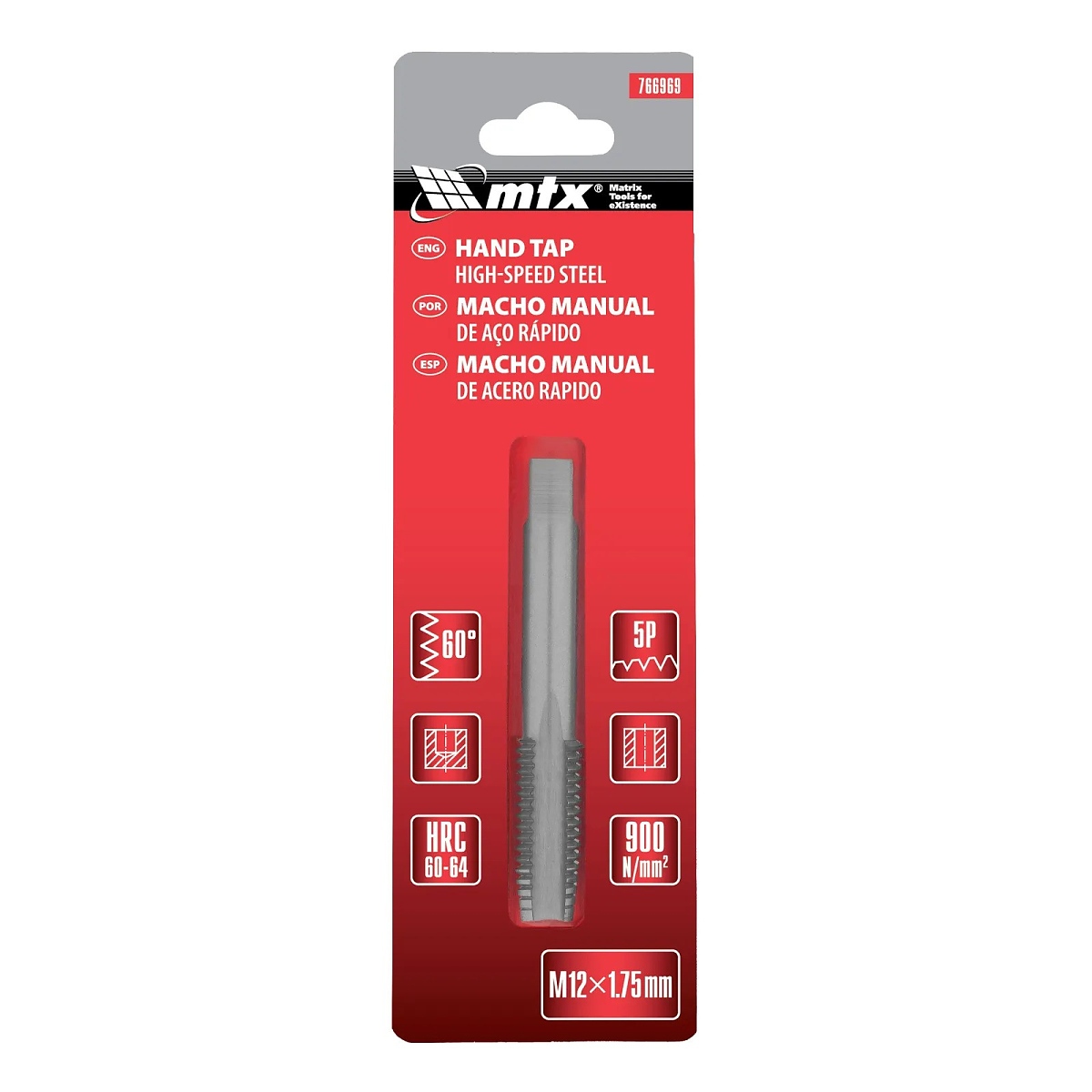 Ръчният метчик MTX 766969, HSS, е инструмент, който се използва за създаване на резба с диаметър М12 и стъпка 1,75 мм. Оптимален за работа с детайли от твърда стомана със здравина до 900 Н/мм2. Реже резбата с един премин. Резецът се монтира на държач за резец с патронник с опашка от 7 мм. Ще бъде полезен в работилница, както и у дома или в гаража.