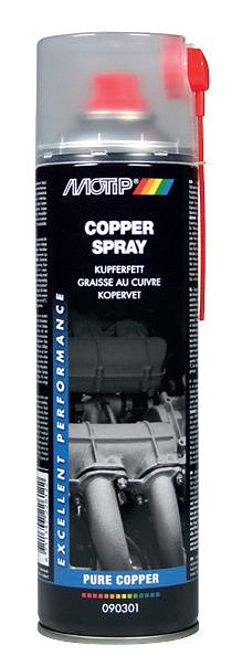MOTIP спрей с мед 1100 градуса - 500 мл - спреят е с високо съдържание на мед за третиране на детайли, излагани на изключително високи температури; продуктът има много добро сцепление с повърхностите и антикорозионни свойства; водоустойчив, устойчив на соли, киселини и смоли; използва се срещу износване, окисляване, корозия, за облекчаване развиването на акумулаторни клеми, тръбни и резбови съединения, автомобилни свещи, спирачки (нанася се върху задната част на накладките за предотвратяване на свиренето) и други.; спреят с мед е устойчив на температури в диапазона от - 40°С до 1100°С.