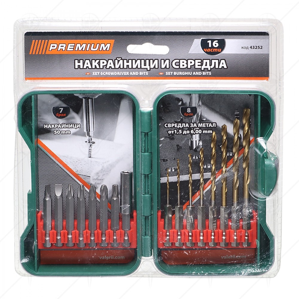 Накрайници и свредла комплект 16 части в удобна кутия с марка PREMIUM Комплекта включва: 8 броя бургии за метал 1/4 7 броя накрайници 50мм 1 брой магнитен удължител