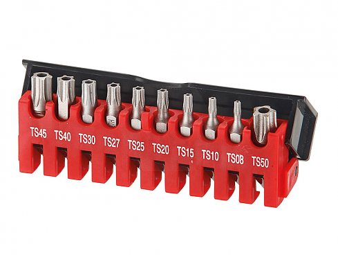 Комплектът съдържа 10 бр. накрайници звезда 5 лъча 1/4" L 25 mm TS08; TS10; TS15; TS20; TS25; TS27; TS30; TS40; TS45; TS50