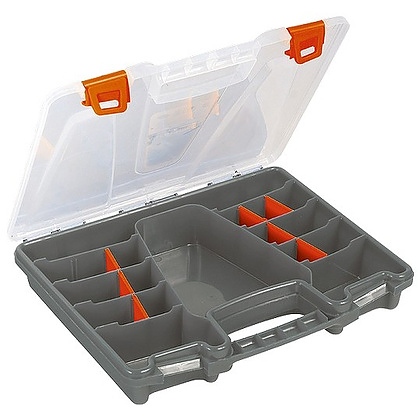 Органайзер от пластмаса Stels 90707 с размери 310 x 250 x 50 мм ви позволява да създадете практично място за съхранение на дребни части. Също така е удобно да го вземете със себе си на полева работа. Органайзерът помага да поддържате работилницата си подредена и предотвратява загубата на части. Предимства Полипропиленовият калъф гарантира защита на съдържанието от влага и прах. Размерът на секциите може да се регулира, което осигурява възможност за съхранение на различни части. Органайзерът е оборудван с дръжка и резета за лесно и безопасно транспортиране.
