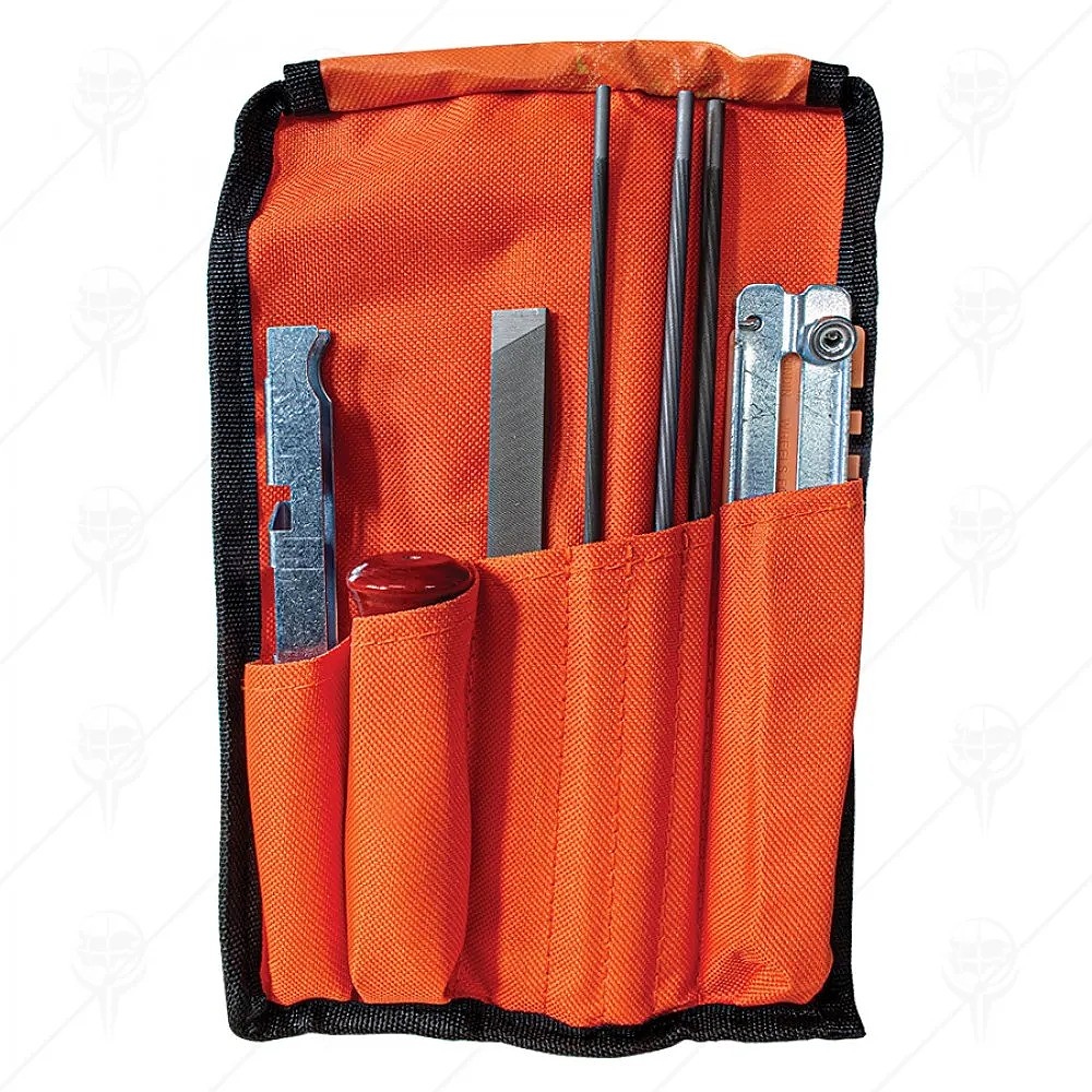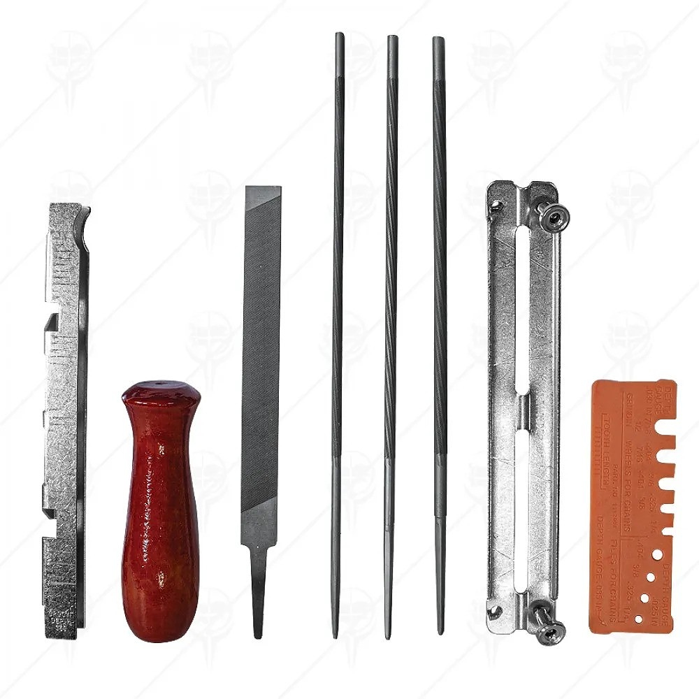 Комплектът включва плоска и 3 кръгли пили, водач, дълбочинен ограничител, шаблон за пила и инструмент за почистване на дъска. Всички елементи са събрани в практичен за съхранение калъф.