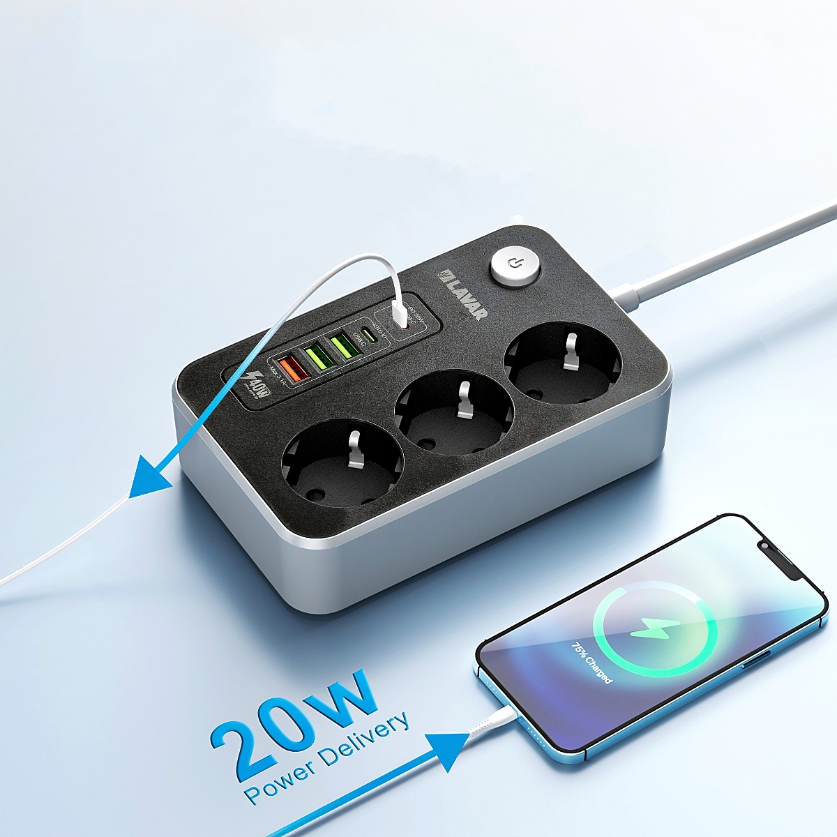 Разклонител LAVAR с USB и TYPE-C. Брой гнезда: 3. Дължина: 2М. USB мощност: 5V/3.4А Max: 17W USB портове 3xUSB-А & 2xUSB-C Макс. товар: 3680W Тип кабел: H05VV-F3G 1,5 mm² Напрежение: 250 V~/16 A max.
