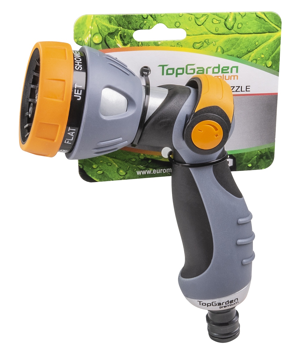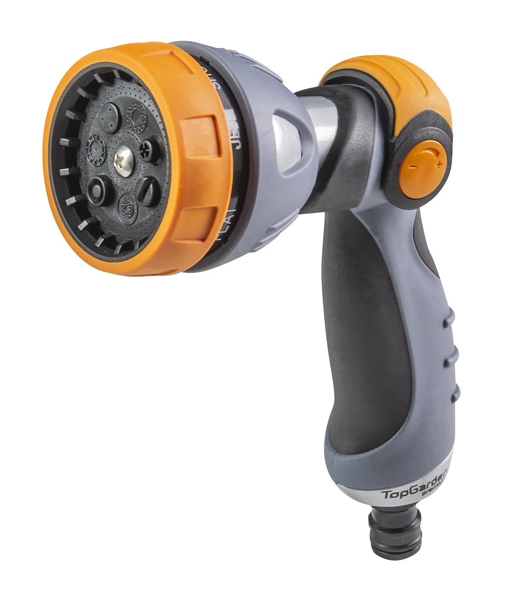 - Снабден е с регулируем накрайник, който осигурява седем режима на поливане