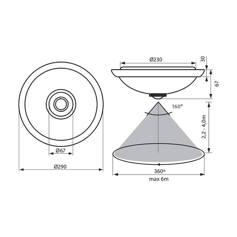 LED плафониерата със сензор за движение LEDA е с обхват 360° и с максимално разстояние на действие до 6 m, 12W, 230V, 4000K. Сензорът включва лампата, когато има обект в зоната на засичане и автоматично изключва осветлението, когато се напусне периметърът на отчитане.