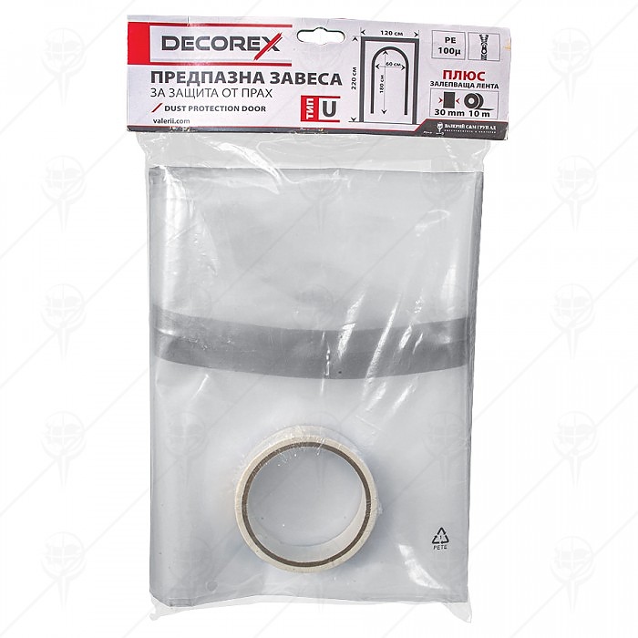 Покривало за защита от прах за врати е изработено от плътно безцветно прозрачно PE фолио с дебелина 100 микрона. Отварящата се част е с форма на буква U и се отваря с пришит цип.