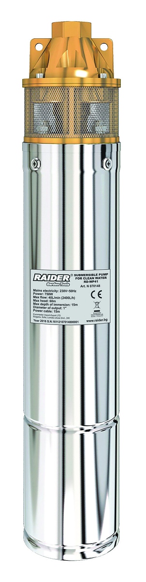 Дълбочинната водна помпа Rider RD-WP41 е предназначена за изпомпване на чиста вода от сондажни отвори, кладенци и резервоари. Управлението на помпата става посредством външно елетрическо табло с вграден волтметър и елетронна система, която предпазва елетродвигателя от прегряване.
