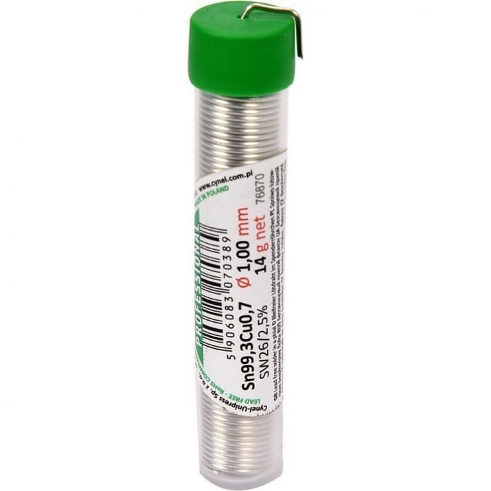 Безоловен припой с флюс, предназначен за ръчно или автоматично запояване на електронни компоненти в телекомуникациите, електрониката и индустриалната и автомобилната електротехника. Безоловните свързващи вещества изискват по-високи работни температури и са малко по-трудни за използване. Съгласно директиви на ЕС се препоръчва използването му пред калай-оловните спойки, поради вредата за здравето, причинена от оловото. Изцяло произведено в съответствие с PN EN 29453: 2000. Високото качество на продукта се осигурява от липсата на достъп на въздух по време на топене.