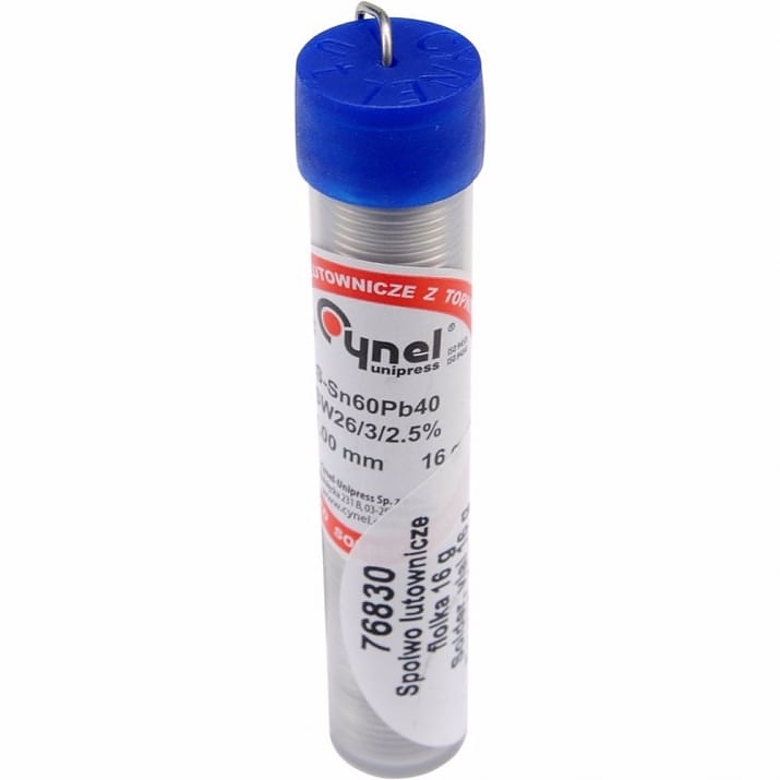 Свързващо вещество за спойка с флюс, получено при първото топене на калай и олово в съответствие с PN EN 29453: 2000, в непрекъснат процес на леене без достъп на въздух, след което се екструдира, което осигурява елиминирането на оксидите. Свързващото вещество е със съдържание на калай от 59.5% до 60.5% и точка на топене от 183 ° С до 190 ° С. Флюсът SW26 е направен на основата на колофон и органичен халогенен активатор, който след запояване се „завързва“ в колофон, което предотвратява директен контакт със спойката и не предизвиква корозия, а също така улеснява топенето и увеличава течността на спойка.