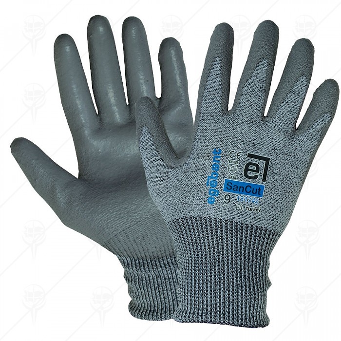Ръкавици противосрезни SANCUT. Ръкавиците са ½ топени в полиуретан със стъклофибърни нишки вплетени в трикото, противосрезни - ниво 3.