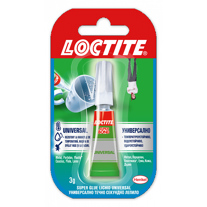 Секундно лепило (цианоакрилат) за голямо разнообразие от материали (пластмаси, порцелан, керамика, гума, каучук, метал, дърво, твърда кожа). Подходящо само за малки и чисти поправки (без липсващи части от предмета), С изключителна лепилна сила: достатъчна е 1 капка върху едната част и веднага се съединяват. Залепва за секунди, без следи (прозрачен е) и предметът може да се използва веднага.