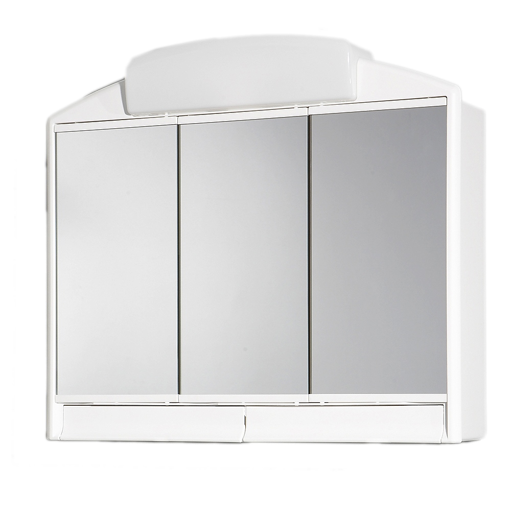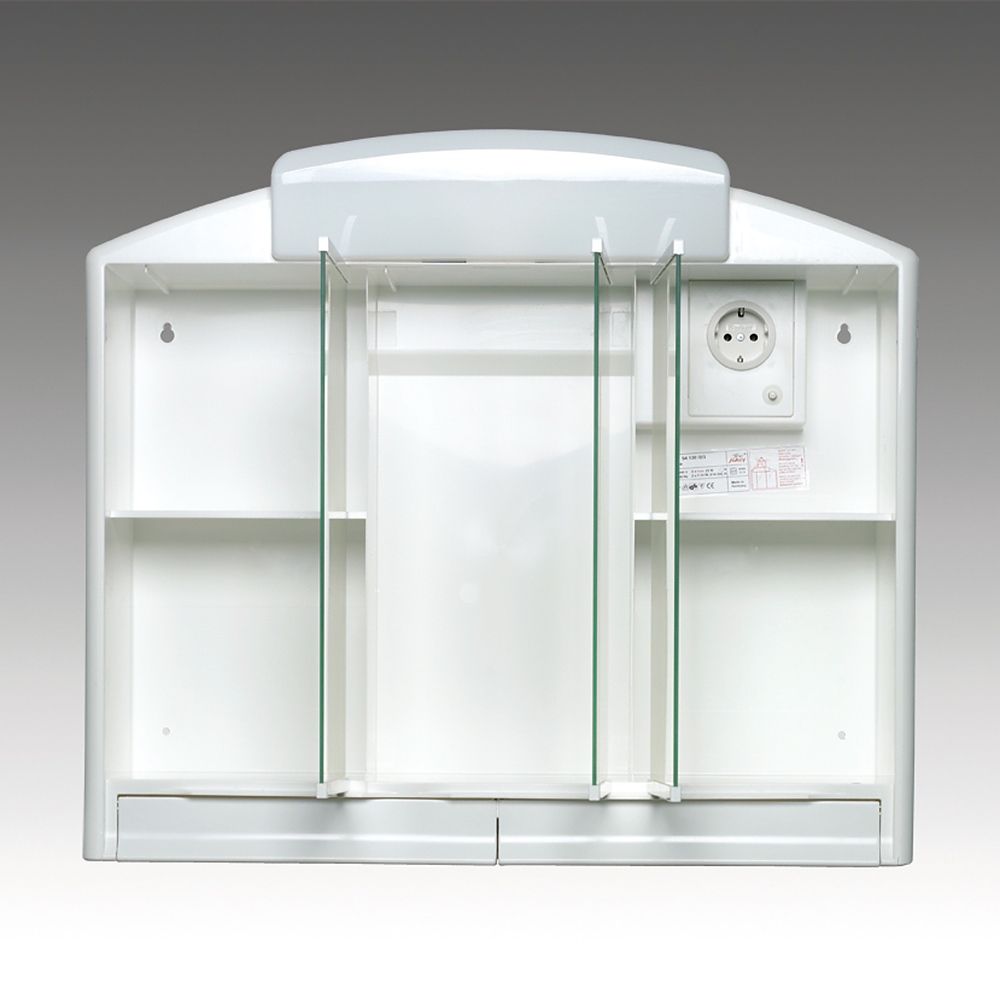 Три врати с кристални огледала, две чекмеджета, фиксирани рафтове, контакт. Осветление: 2 енергоспестяващи крушки E14, 9-14 W и 2х25 W крушки тип свещ Е14.