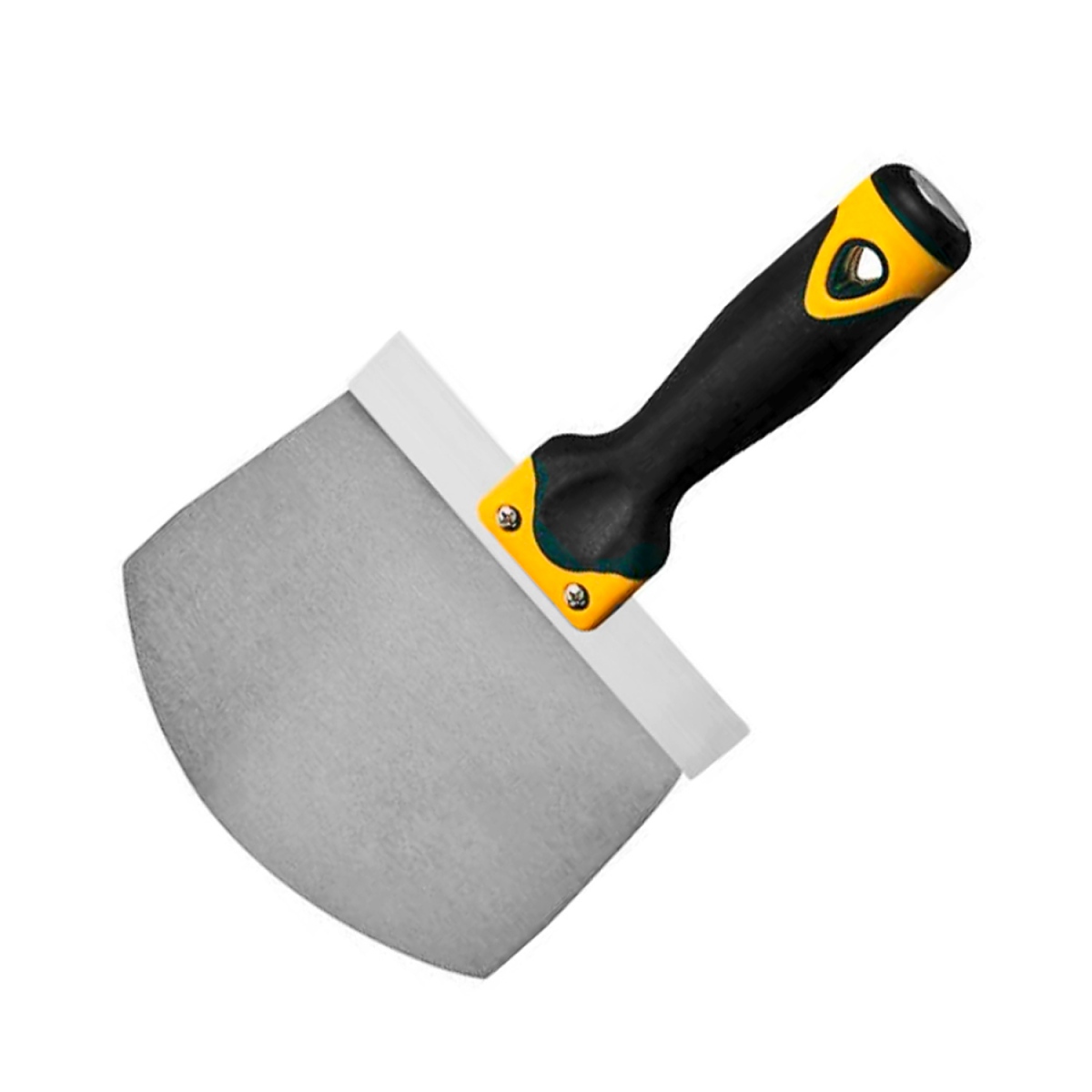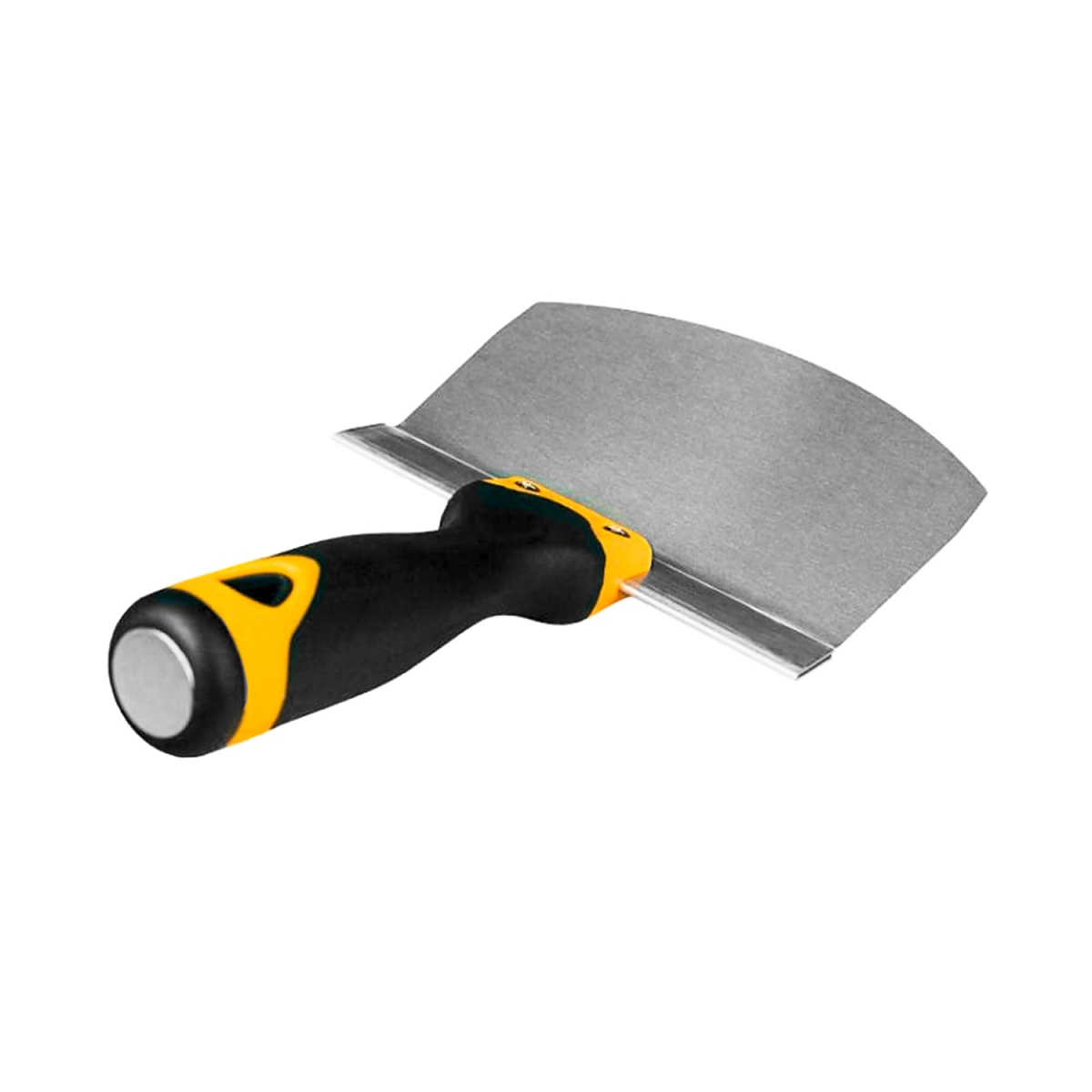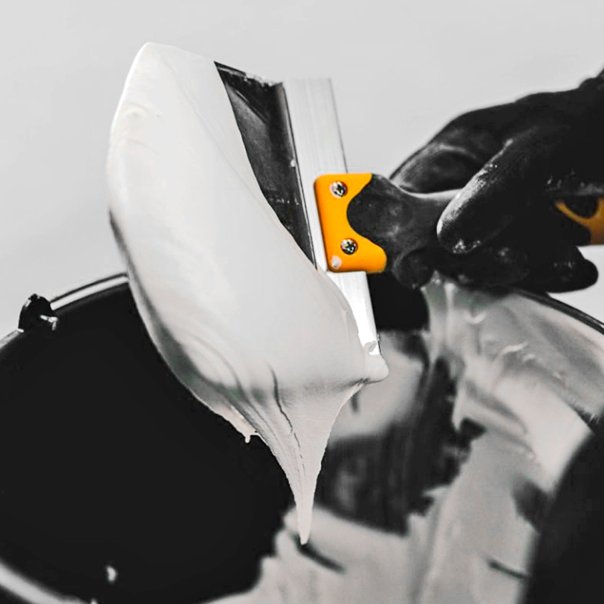 Универсална шпакла с широчина 165 мм, предназначена за цялостно обиране на разтвори, епоксидни смоли, лепила, цимент, пълнители и мазилки от всички размери кръгли кофи.