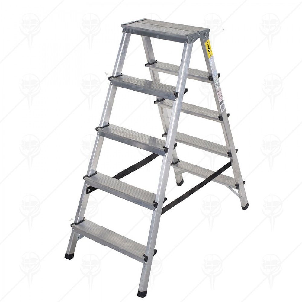 Стълба домакинска двустранна Drabest е изработена от алуминий, свободно стояща, произведена в Полша. Стълбата е с двустранен вход, 2х5 неплъзгащи се стъпала с ширина от 80 мм, което гарантират безопасност при качване и слизане от стълбата. Също така стълбата притежава нитове, ролки и пластмасови капачки против приплъзване, които определено повишават безопасността. Товароносимостта на стълбата е до 125кг, а височината до 3,1 м. При разгъването, тя изглежда, като класическите, тип бояджийски, но последните две стъпала образуват площадка. Тези стълби са зключително удобни за дълъг престой, като боядисване и инстлации.