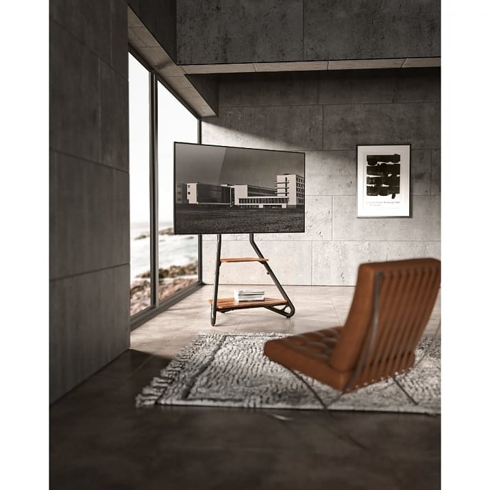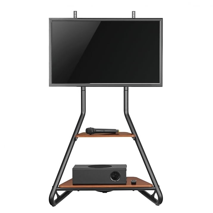 Ъглова подова стойка за телевизор с 2 дървени рафта. Хармонично балансираните форми съчетават в себе си авангардно и модерно в едно. Добавете стил към интериора, като се възползвате максимално от функционалността на стойката.