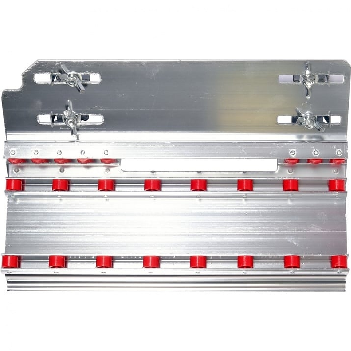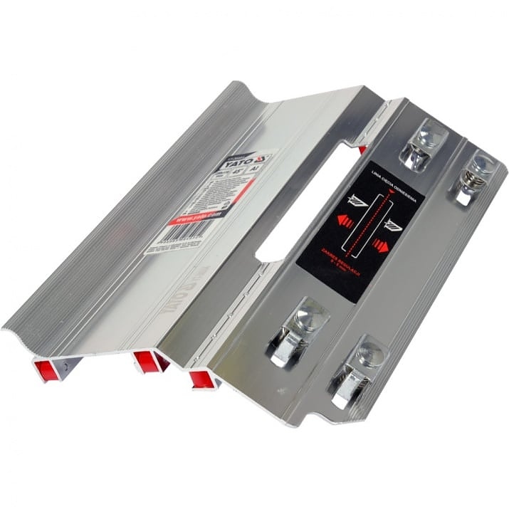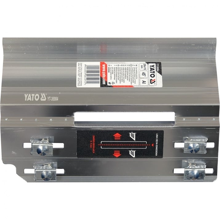 Водач за прецизно изрязване (шлайфане) ръбовете на керамични плочки под 45°. Корпусът, изработен от алуминий, е оборудван с пластмасови ролки за улесняване на плавното плъзгане по плочката.